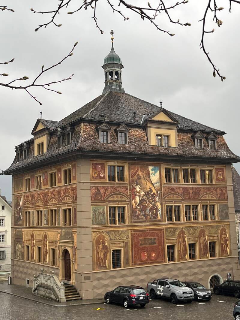 Rechts: Rathaus von Schwyz mit schönen Wandmalereien.