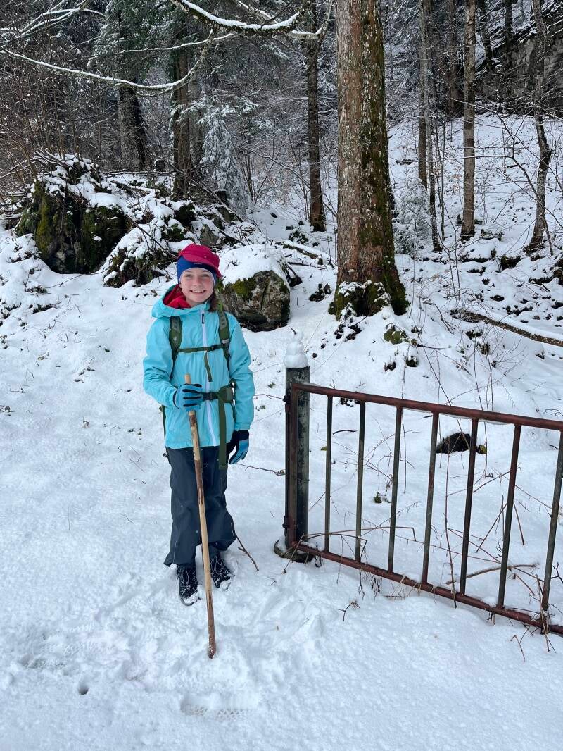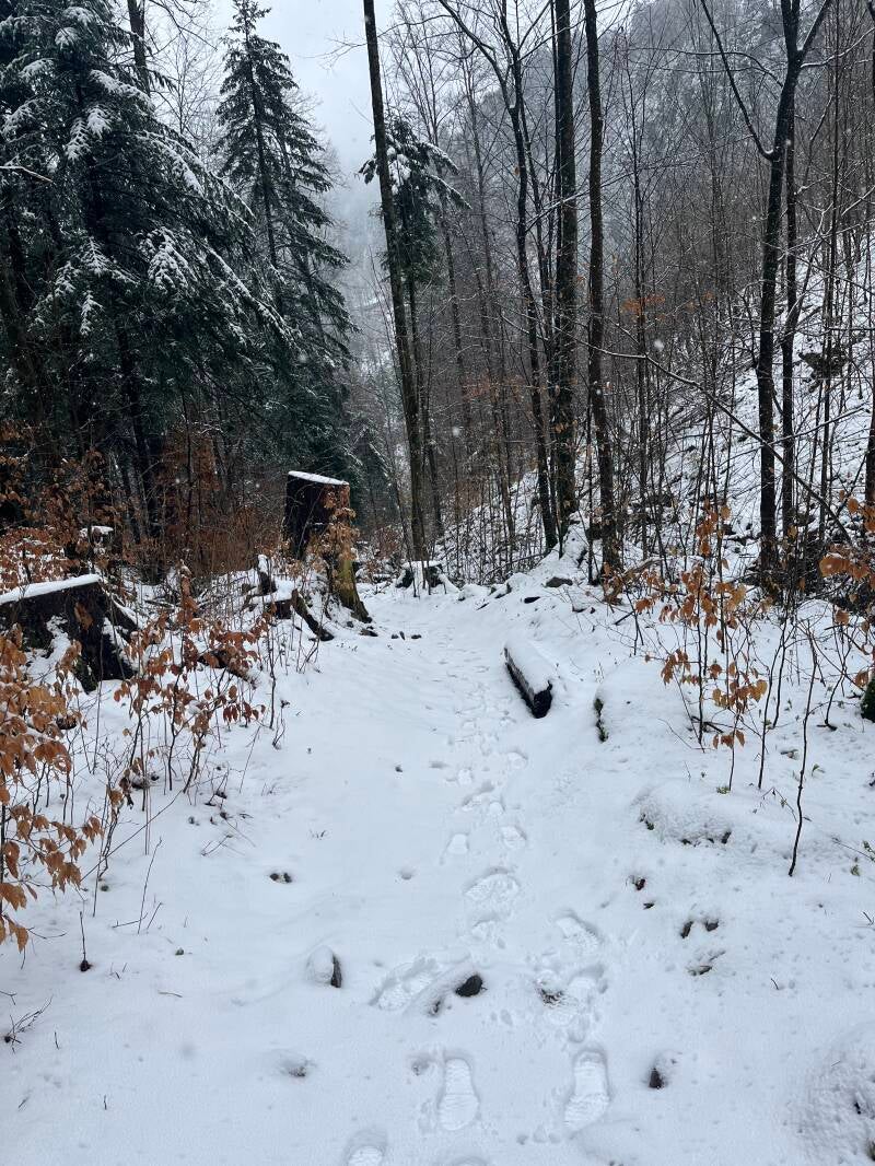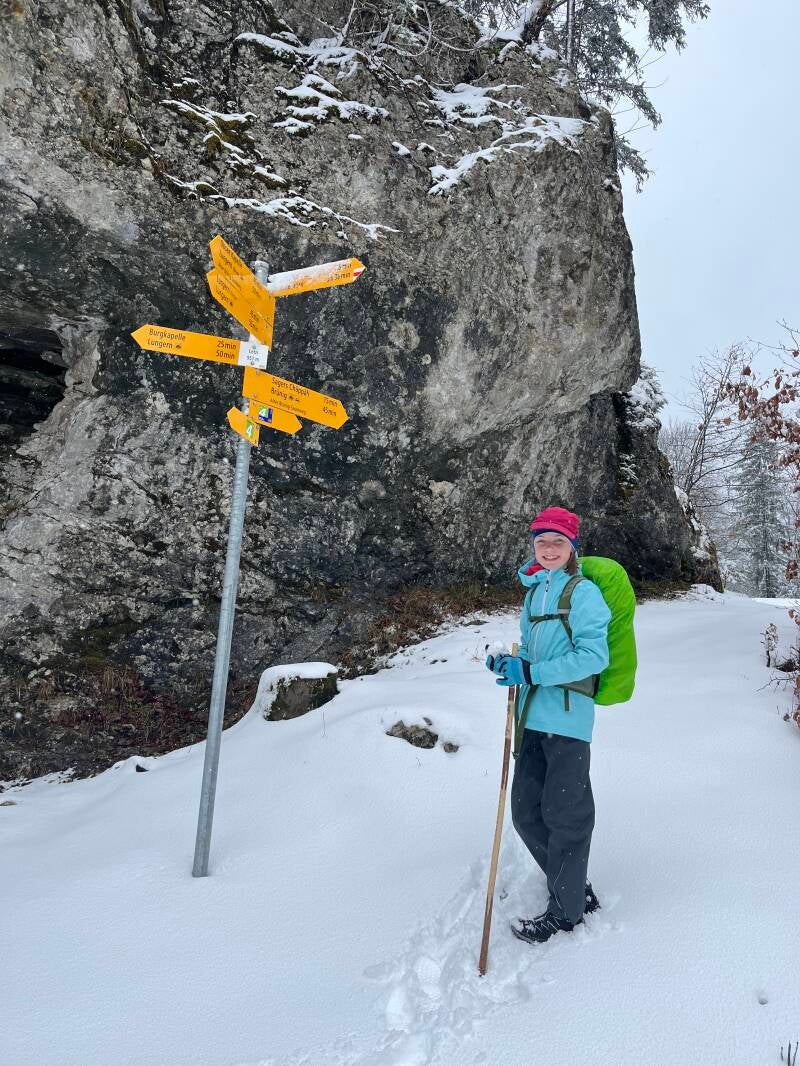 Was dann folgte, stellte aber alle unsere Erwartungen in den Schatten. Der Schneefall hörte nicht auf und mit jeder Kurve bergan, schloss sich mehr und mehr die Schneedecke. Eine halbe Stunde später waren wir komplett eingeschneit und konnten die 300 Hm Aufstieg auf den Brünigpass komplett durch den Schnee stapfen. Gut war, dass es deutlich weniger glitschig war, als der Schneematsch-Laub-Mix vom Vormittag. Allerdings dauert der Aufstieg dann deutlich länger, statt der veranschlagten 1 3/4 Stunden haben wir schlussendlich 3 gebraucht - was v.a. an mir lag. Katharina war energiegeladen unterwegs, hat immer die Route im Schnee erkundet und nebenher noch Schneemänner gebaut. Aber seht selbst: