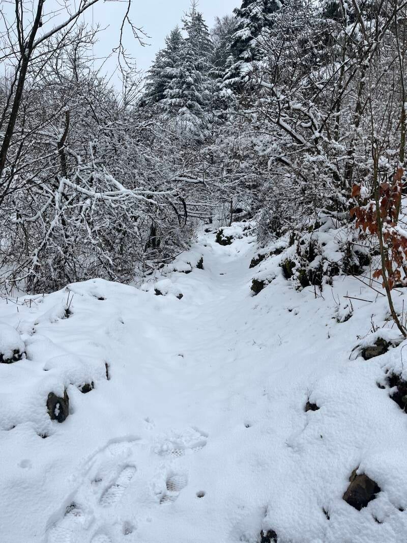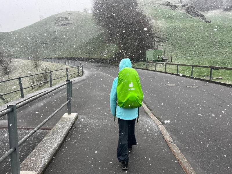 Mit dem ersten Anstieg von rund 200 Höhenmetern nach Kaiserstuhl setzte der Niederschlag ein und dieser sollte uns dann auch die nächsten Stunden Aufstieg begleiten - zunächst als Regen, dann als Graupel und schließlich als kräftiger Schneefall.