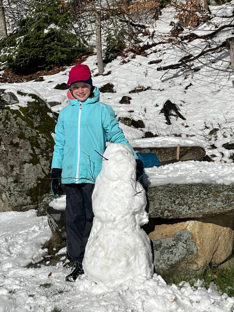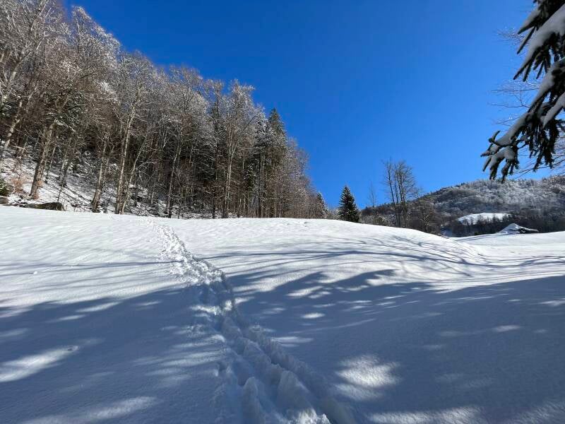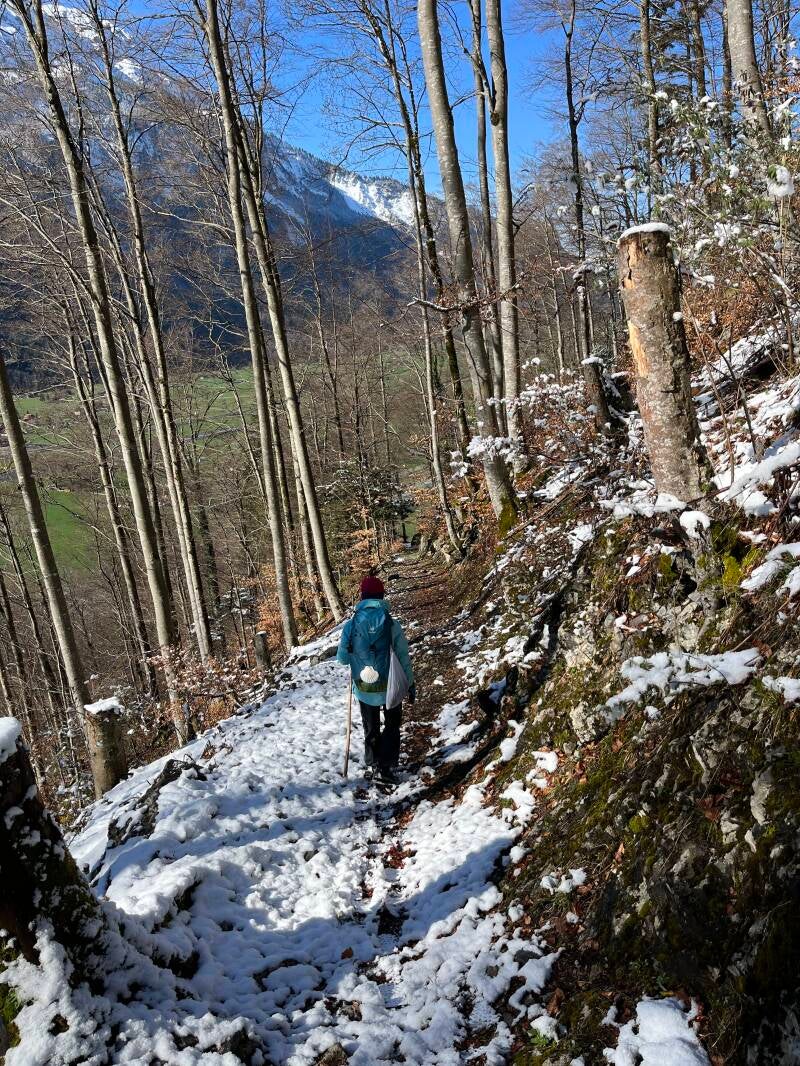 Wir mussten aber aufgrund des vielen Schnees unsere Wegführung ändern. Pilger Matthias, der am Vortag noch ein Dorf weiter gegangen war, hatte über unsere Herberge Kontakt mit uns aufgenommen und uns dringend vom direkten, steilen Abstieg nach Brienzwiler abgeraten - zu gefährlich. So haben wir dann digitaler Karten, tollem Wanderwegnetz und GPS-Navigation rasch eine flachere, längere Abstiegsroute nach Brienzwiler gefunden. Es folgte ein wahres Tiefschnee-Abenteuer, der Weg war spannend, aber machbar und Zeit für eine kurze Rast mit Schneemann-Bau haben wir auch noch gefunden.