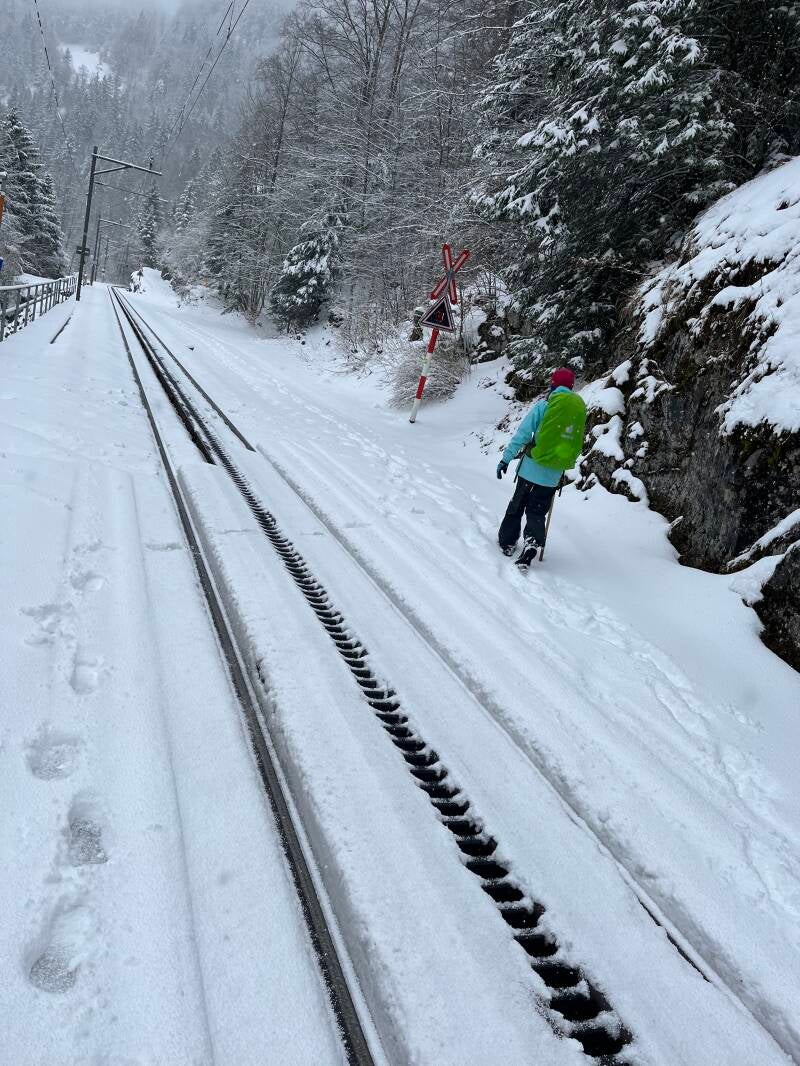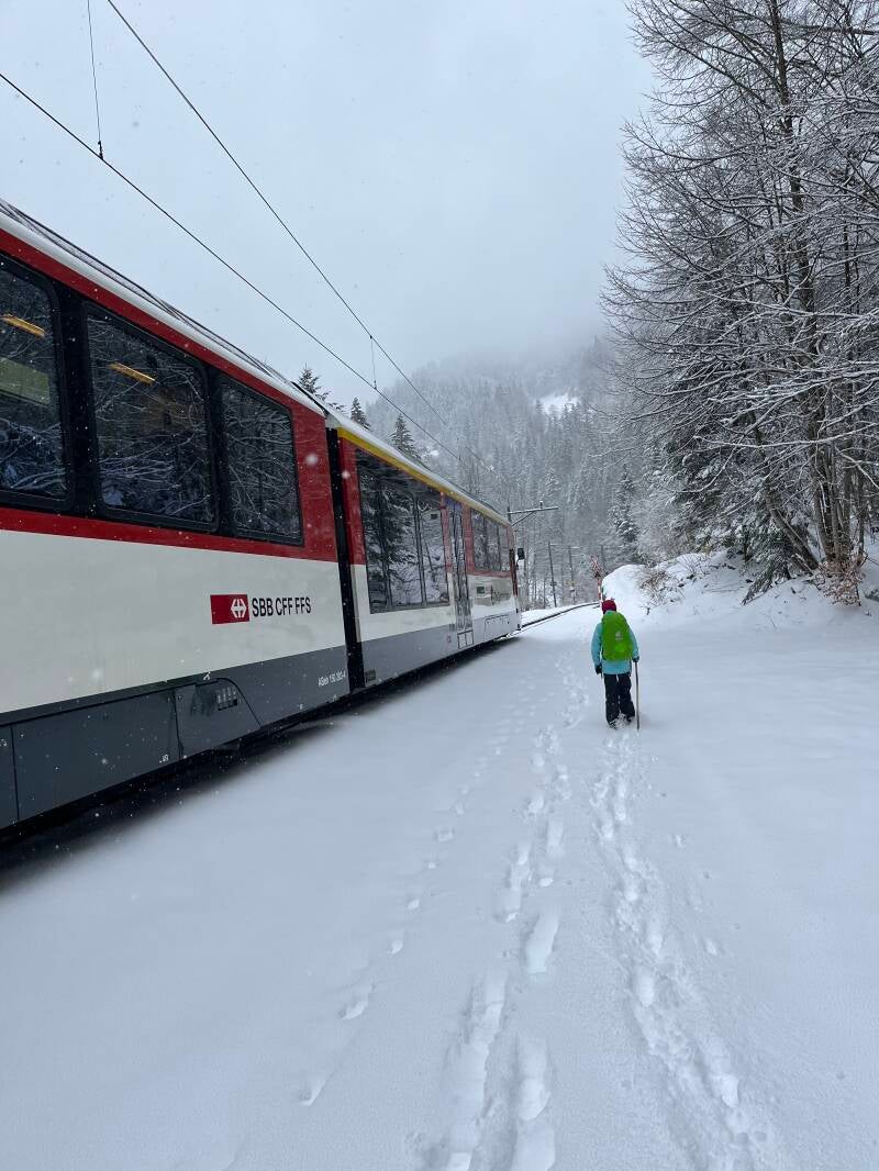Die Bahn Luzern-Interlaken, die hier verkehrt, braucht auch nicht ohnegrund eine Zahnstange in der Mitte der Gleise zur Unterstützung. Ansonsten wäre sie bei der Steigung und bei solcher Witterung wohl aufgeschmissen.