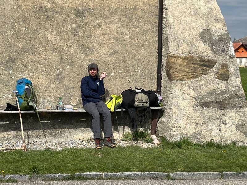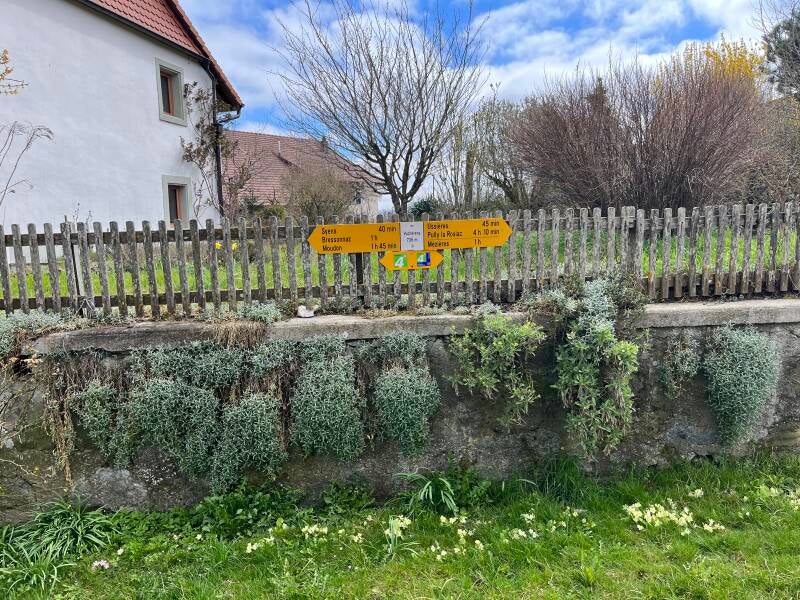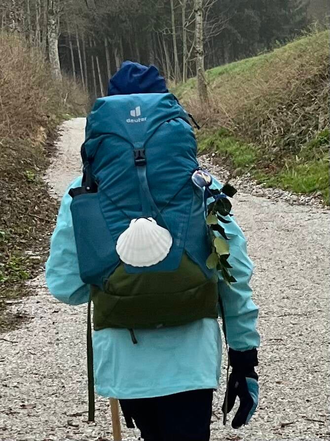 Neben dem Wimpel aus Schwarzenburg haben wir seit gestern Morgen auch einen gesegneten Palmzweig mit am Rucksack. Gestern war der nur den ganzen Tag unter dem Regenschutz verborgen.