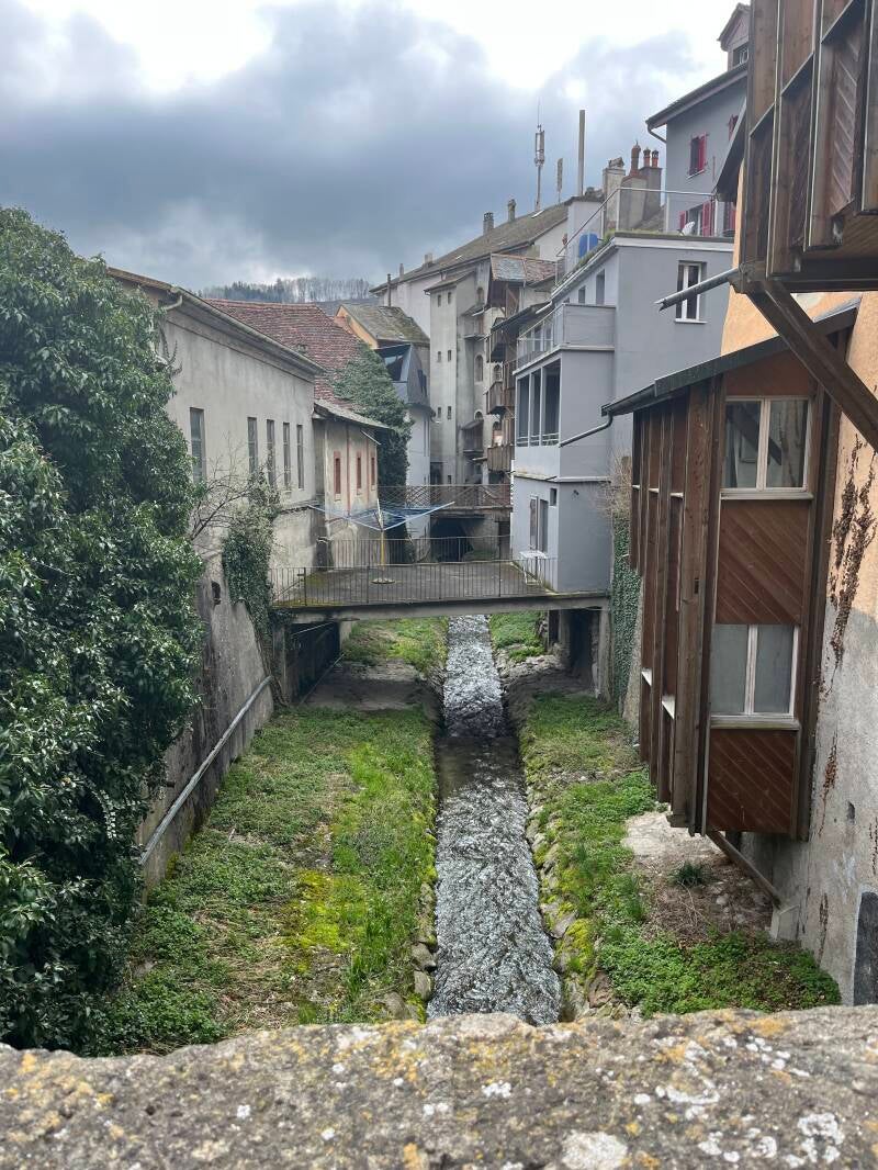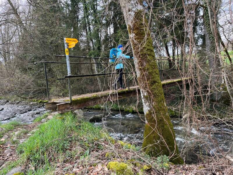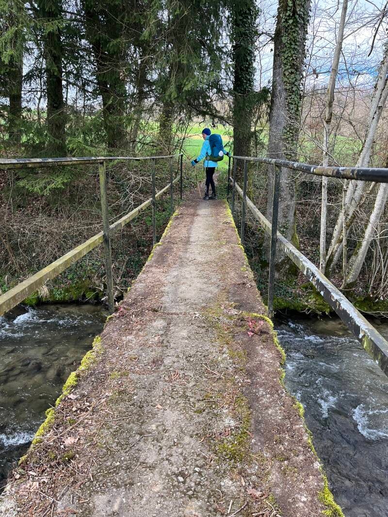 ...und dann über waghalsige Brückenkonstruktionen dem Flüsschen La Carrouge.
