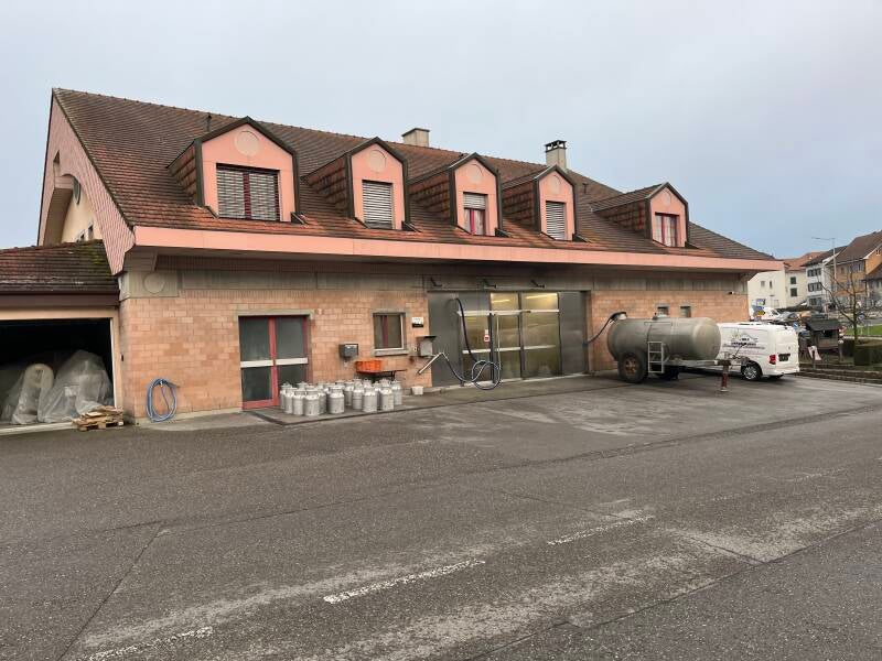 Wir kamen kurz nach dem Start auch an einer Käserei vorbei, wo - so unsere Vermutung - kleine Bauern selbst ihre Milch anliefern können, hier in der Gegend wird viel der Schweizer Nationalkäse "Gruyere" produziert. Zumindest hatten wir auch gestern schon einen ähnlichen Tankvorgang beobachten können.