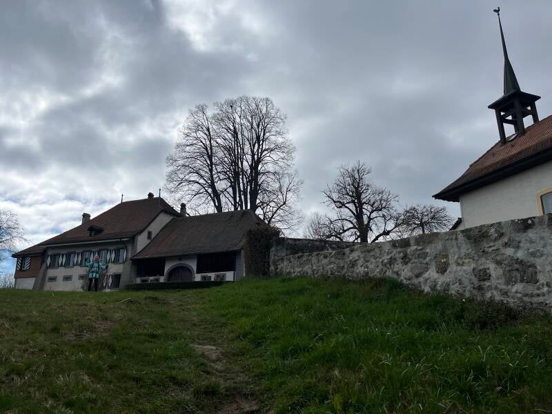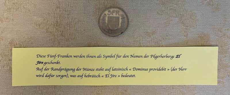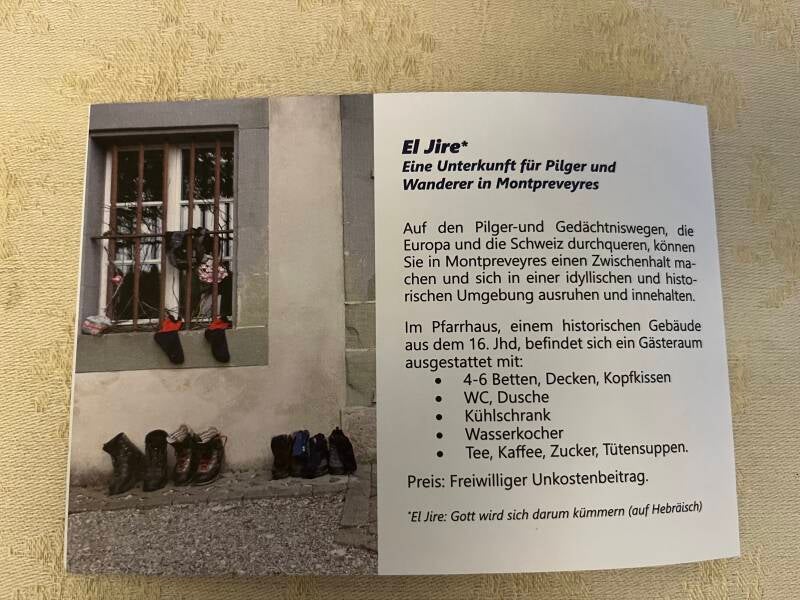 Schließlich erreichten wir dann gegen 16:30 Uhr die Pilgerherberge "El Jire" in Montpreveyres. Die ehrenamtlich betriebenes Pilgerherberge ist schlicht, aber hat ein ganz bemerkenswertes Konzept: Es gibt einen Schlafsaal mit 4 Betten, gemeinsamer Du/WC, eigener Schlafsack nötig. Keine Möglichkeit zum Frühstück oder Abendessen oder Kochen, man muss sich essen mitbringen (wir hatten in Moudon dafür extra eingekauft). Keine Gebühr für die Übernachtung, stattdessen eine Spendenbox. Und man erhält sogar als Symbol / Erinnerung ein 5-Franken-Stück geschenkt mit der lateinischen Randprägung "Dominus providebit", was auf deutsch "Der Herr wird dafür sorgen" meint und dessen hebräische Übersetzung "El Jire" der Name der Herberge ist. Eine wirklich spannende Initiative und ich hoffe, dass sie sich lange tragen wird.
